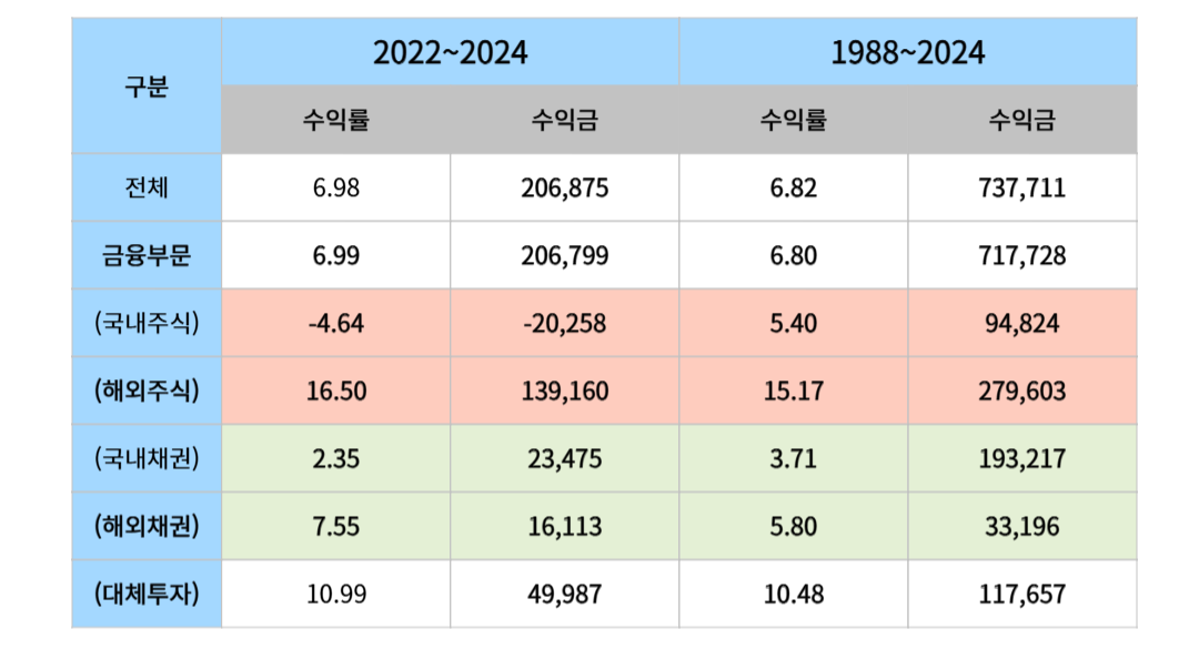 하지만, 사실 국민연금의 1988년부터 2024년 평균 수익률은 무려 6.82%입니다.
