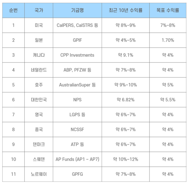 그래서 해외의 국민연금 기금 운용사들의 수익률을 가져와 봤습니다.