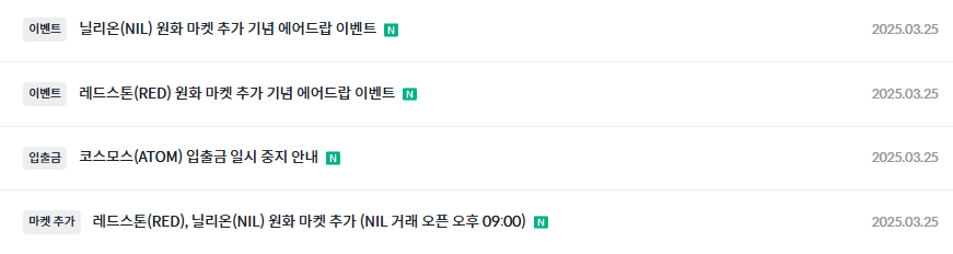 2025년 3월 25일 기준으로는 2개 코인이 원화 마켓에 추가되었는데, 아래 그림과 같이 RED와 NIL이 추가되었습니다.