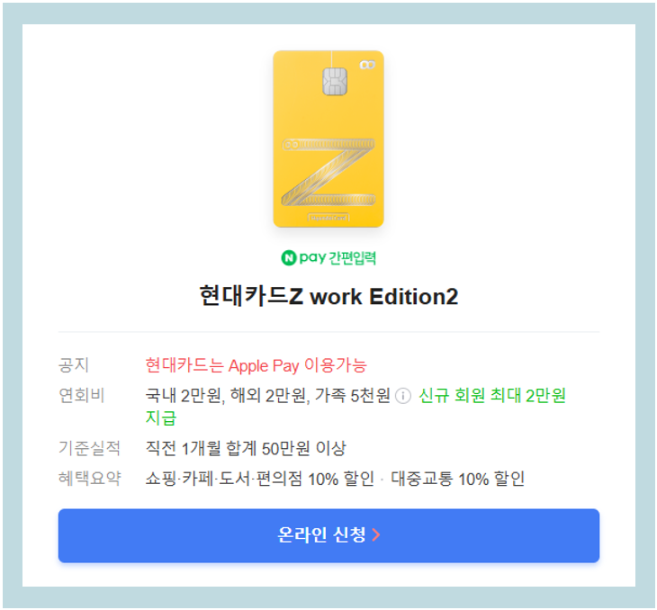 반면에 네이버페이 현대카드의 경우 전월 실적 30만원 이상인 경우 월 이용 금액 20만원에 대해 5%(1만원) 적립됩니다. 아쉽게도 네이버페이 현대카드의 경우 현재 단종되고 에디션2가 출시되었지만요.
